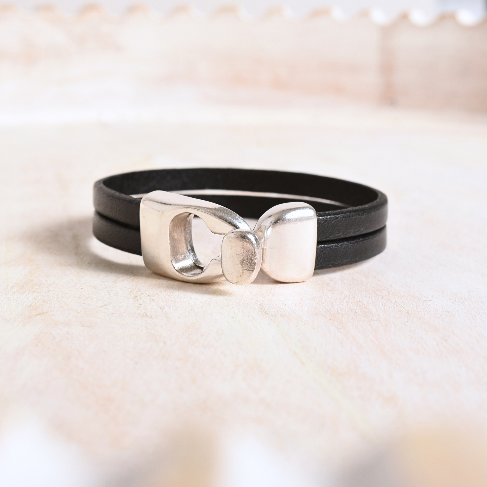 This sleek bracelet features a black leather band paired with a unique keyhole silver clasp, blending modern design with classic elements. Its stylish and secure closure makes it a standout accessory for any occasion.