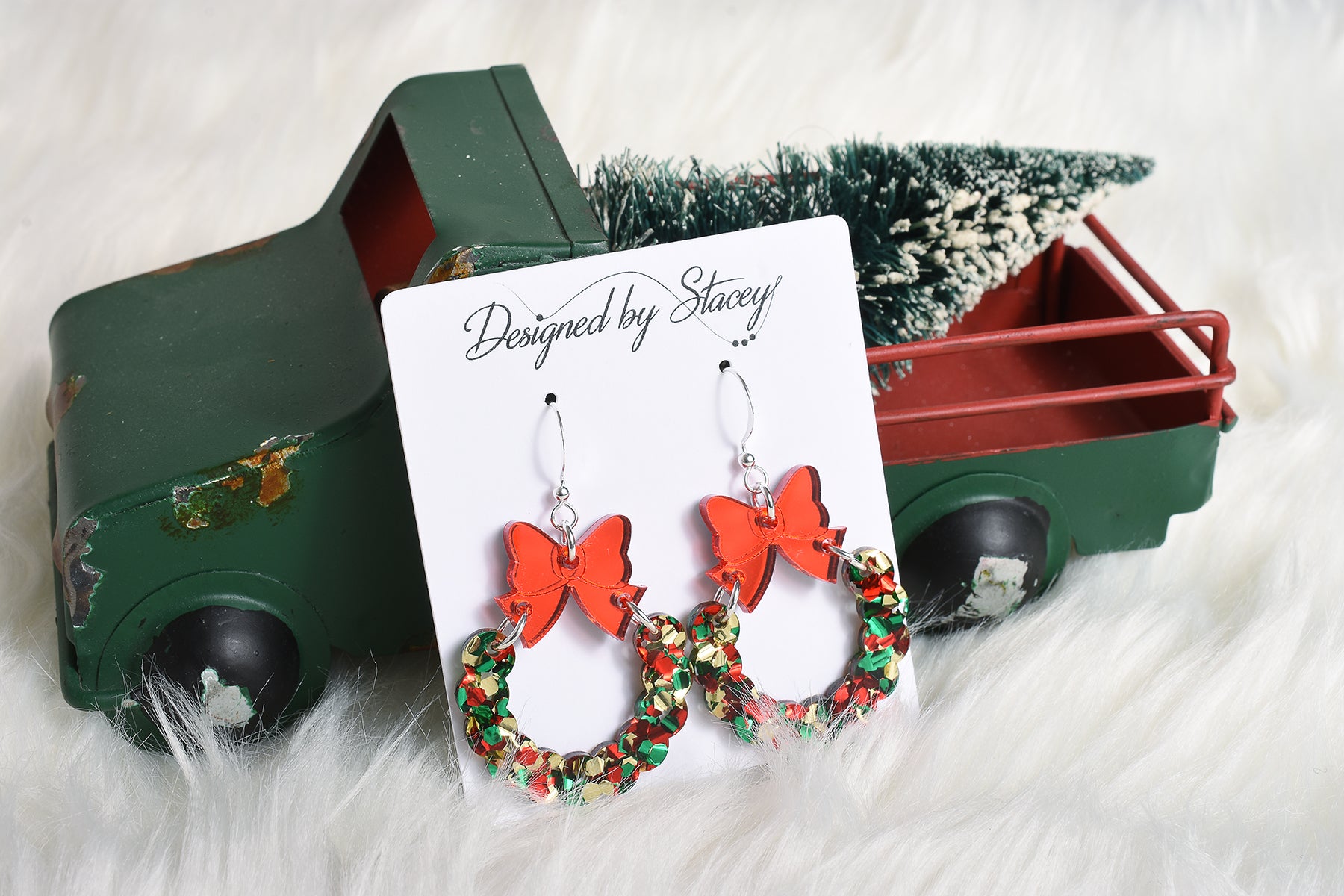 Celebrate the season with our sparkly Christmas Wreath Earrings, where festive charm meets refined elegance. Each pair features shimmering details that catch the light beautifully, creating a dazzling sparkle with every movement. The bold wreath design makes a confident statement while maintaining a polished, upscale aesthetic. Perfect for holiday gatherings, these earrings blend playful spirit with sophisticated style, adding just the right touch of glamour to your seasonal look.