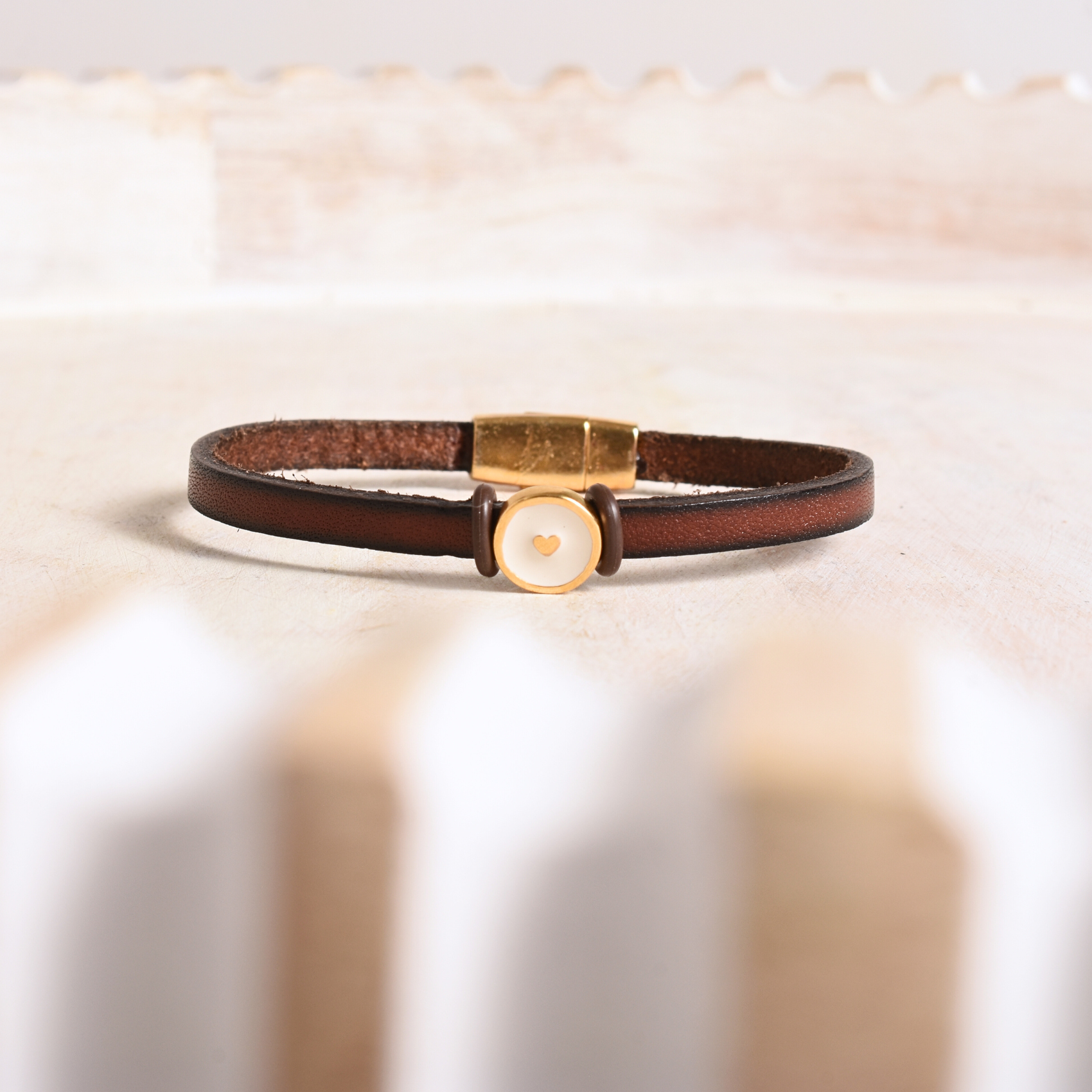 This charming bracelet features a tan leather band adorned with an enameled heart bead and a delicate yet durable gold magnetic clasp. Its blend of warm tones and elegant design makes it a lovely accessory for any occasion.