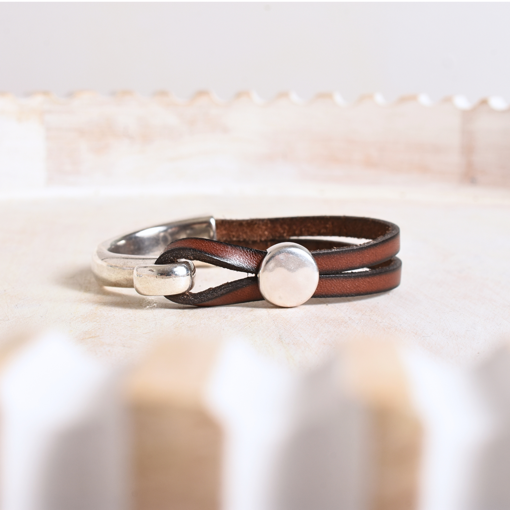 This sophisticated bracelet combines a sleek silver cuff with a rich chestnut brown leather band, creating a striking contrast of textures and tones. Its refined design adds a touch of elegance to any ensemble, making it a versatile accessory for both casual and formal wear.