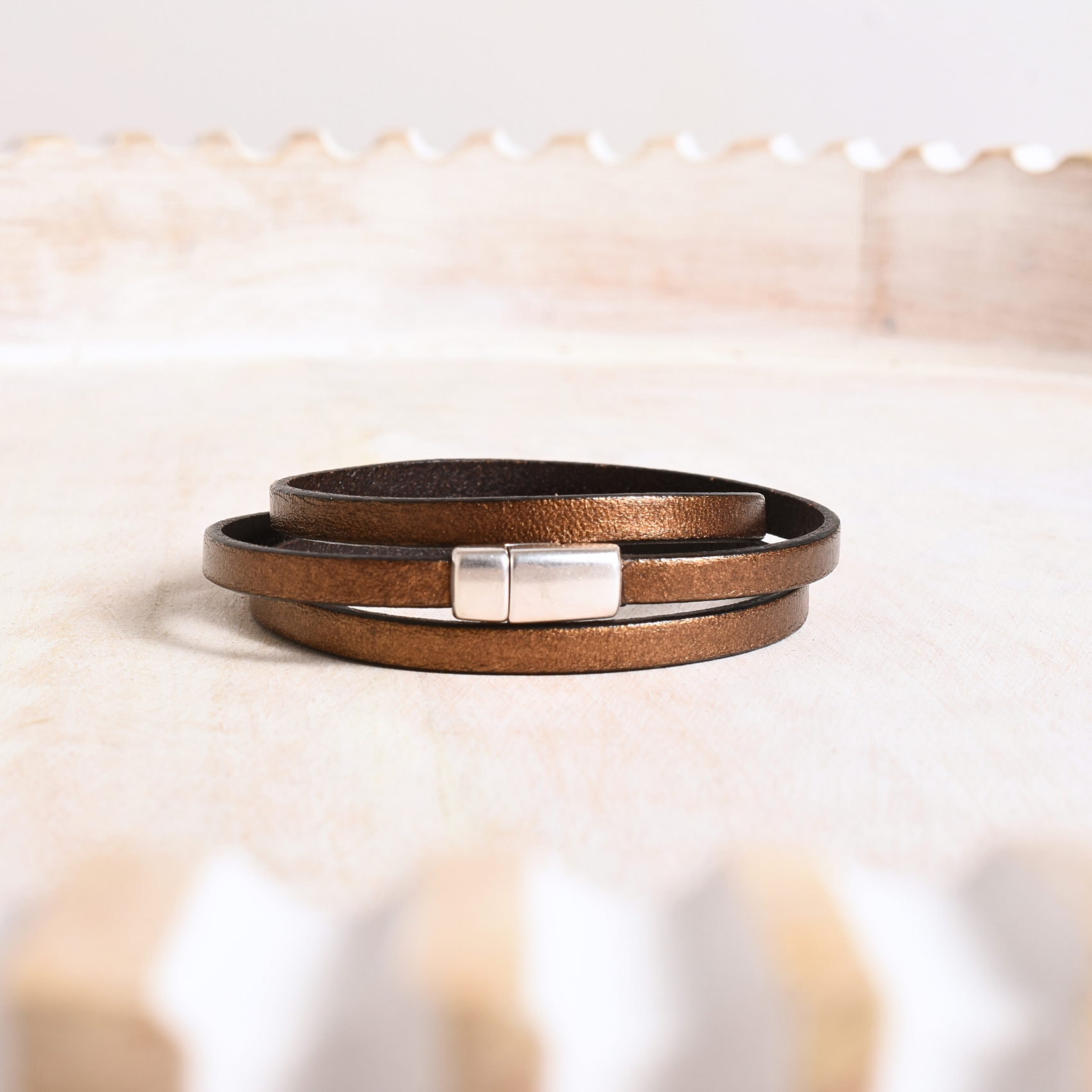 This stylish wrap bracelet features 5mm flat metallic brown leather accented by a magnetic clasp, designed to wrap around the wrist three times for a layered look. Its shimmering finish and versatile design make it a chic accessory for any outfit.