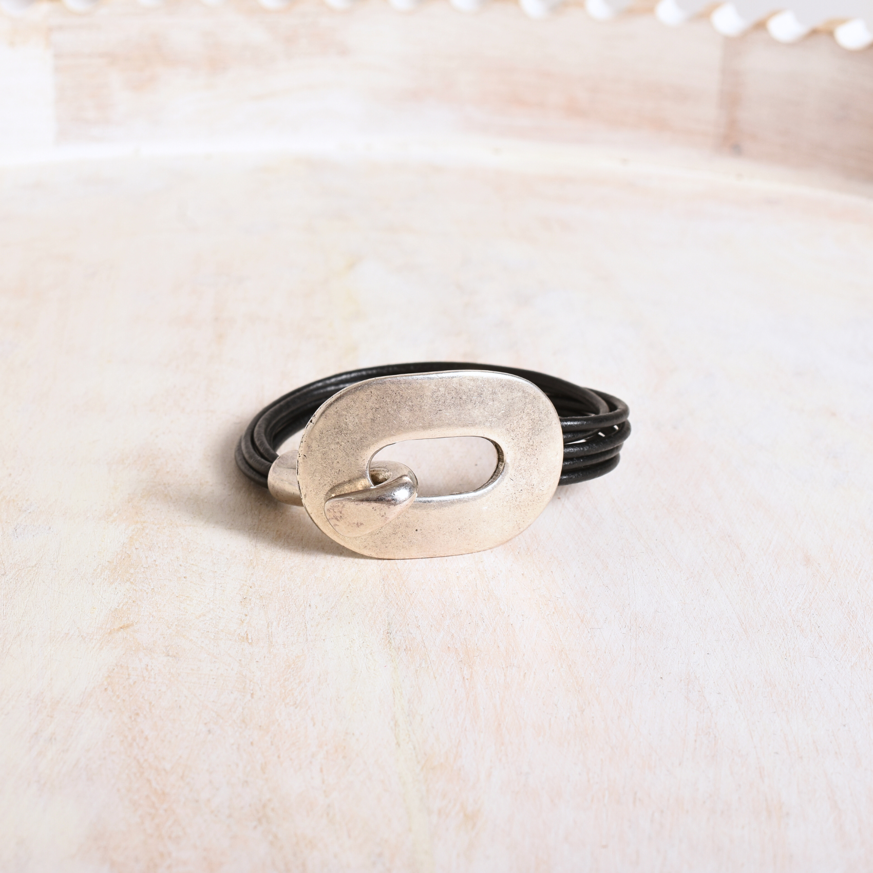 This statement bracelet features a striking silver hook clasp paired with multiple dainty black leather cords, creating a perfect balance of bold and delicate elements. Its unique design adds a touch of modern elegance to any outfit, making it a versatile accessory for both casual and formal occasions.
