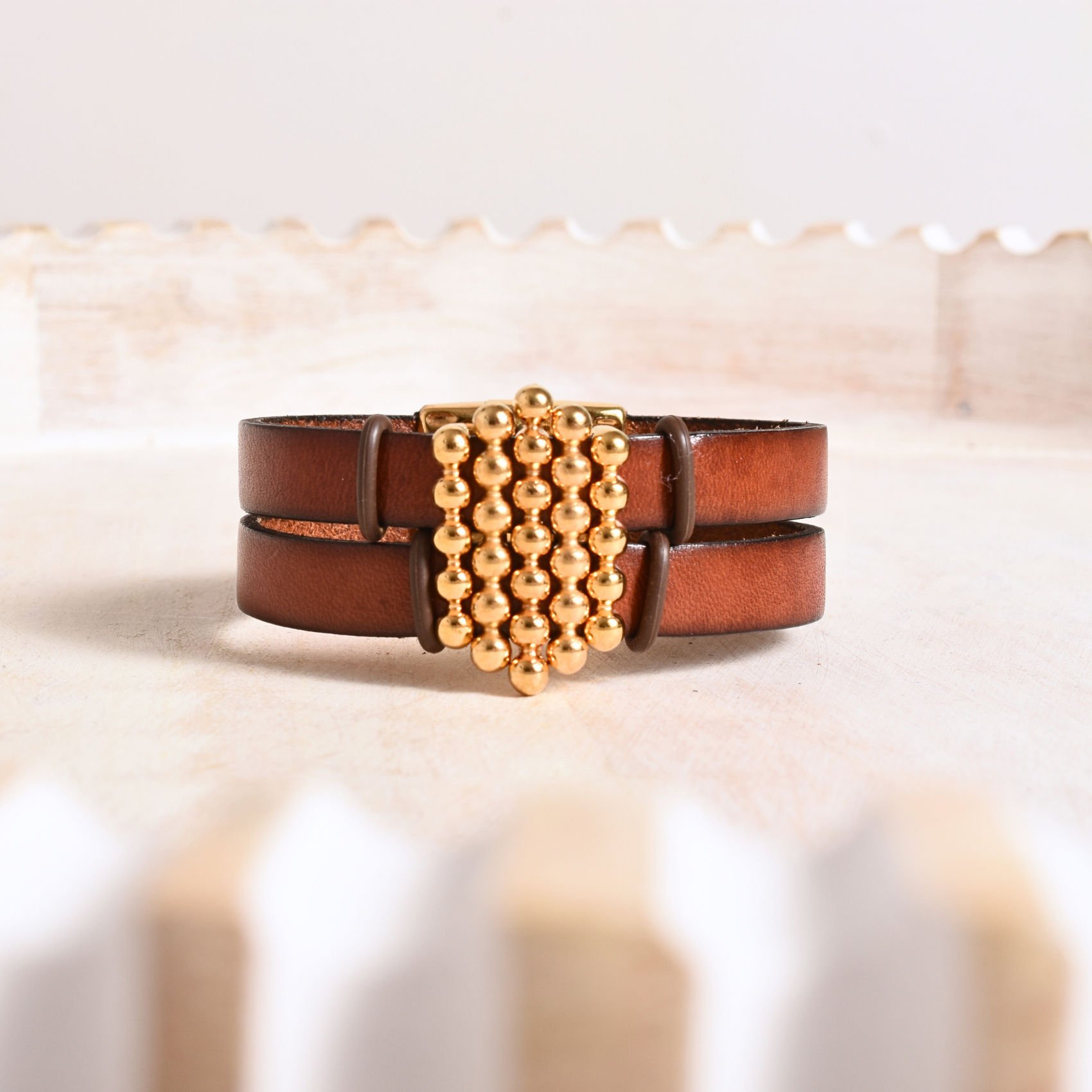 This striking bracelet features a tan leather band adorned with gold statement dotted slider beads, offering a blend of elegance and modern design. Its bold accents and warm tones make it a standout accessory for any ensemble.