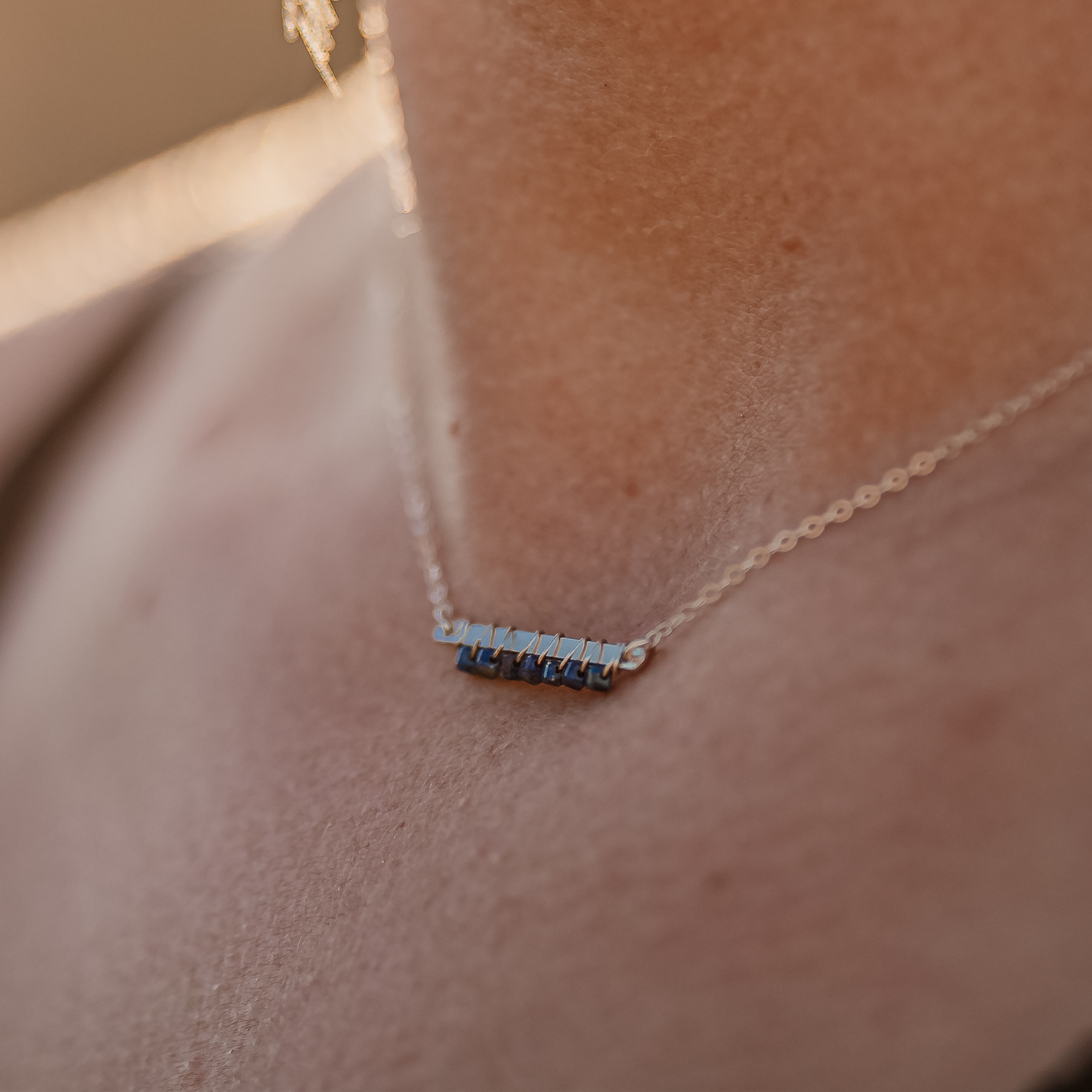 Bold yet beautifully minimal, this Aubrey Necklace features rich navy blue stones arranged in a sleek horizontal setting. Prized since ancient Egypt, lapis lazuli was once ground into pigment for Cleopatra’s iconic eye makeup. Perfect for layering or wearing solo, this piece adds a sophisticated pop of color and timeless elegance to any outfit.
